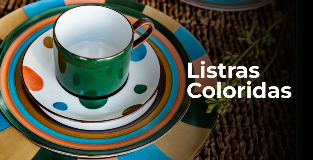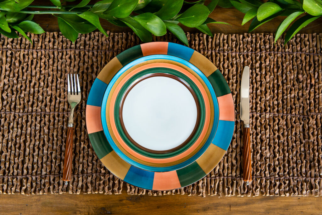 Prato raso branco com bordas de listras coloridas.