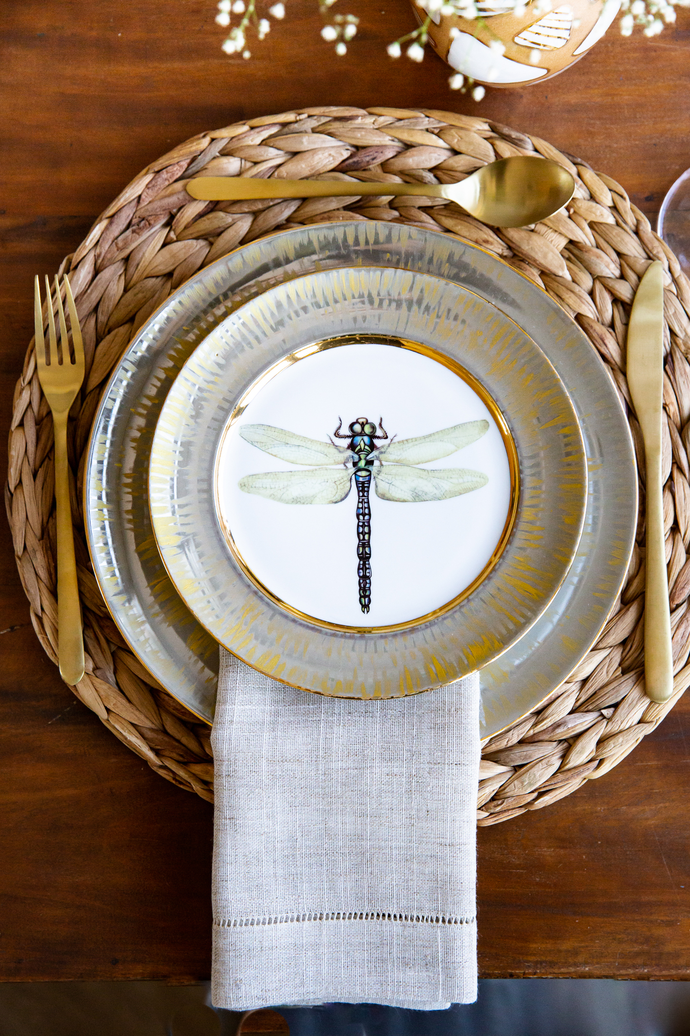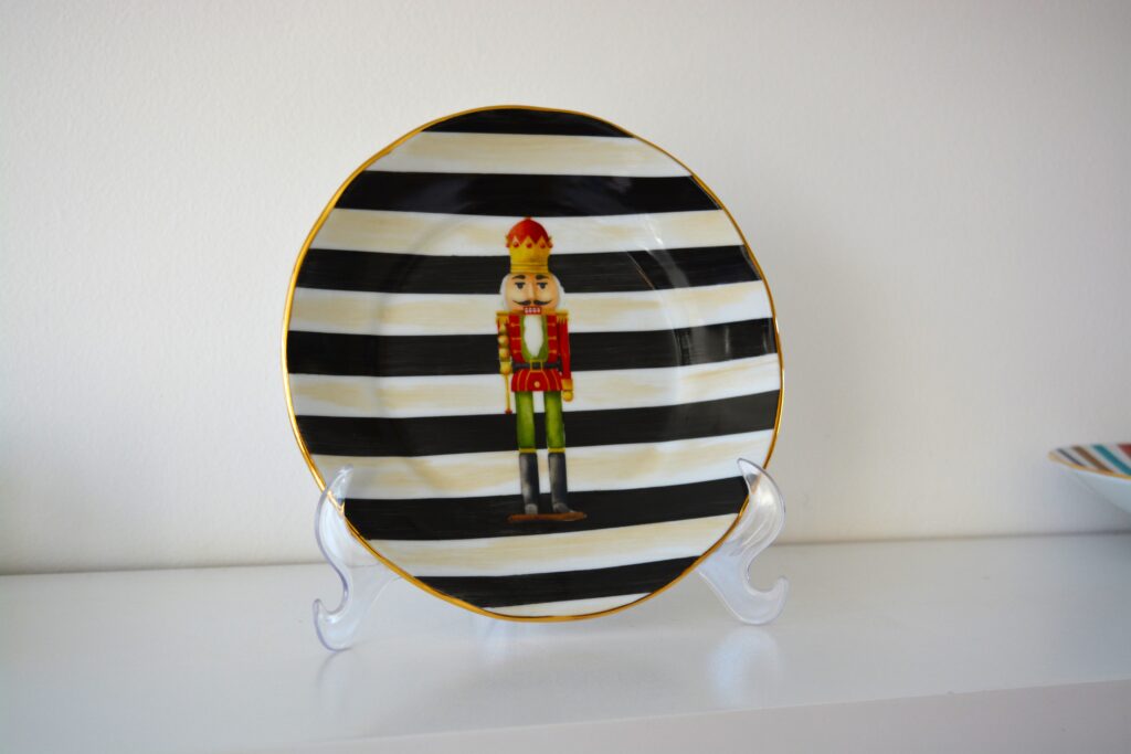 Prato de sobremesa com listras pretas e pinceladas bege, com estampa de soldadinho quebra-nozes e acabamento em ouro 12%, medindo 19cm de diâmetro.
