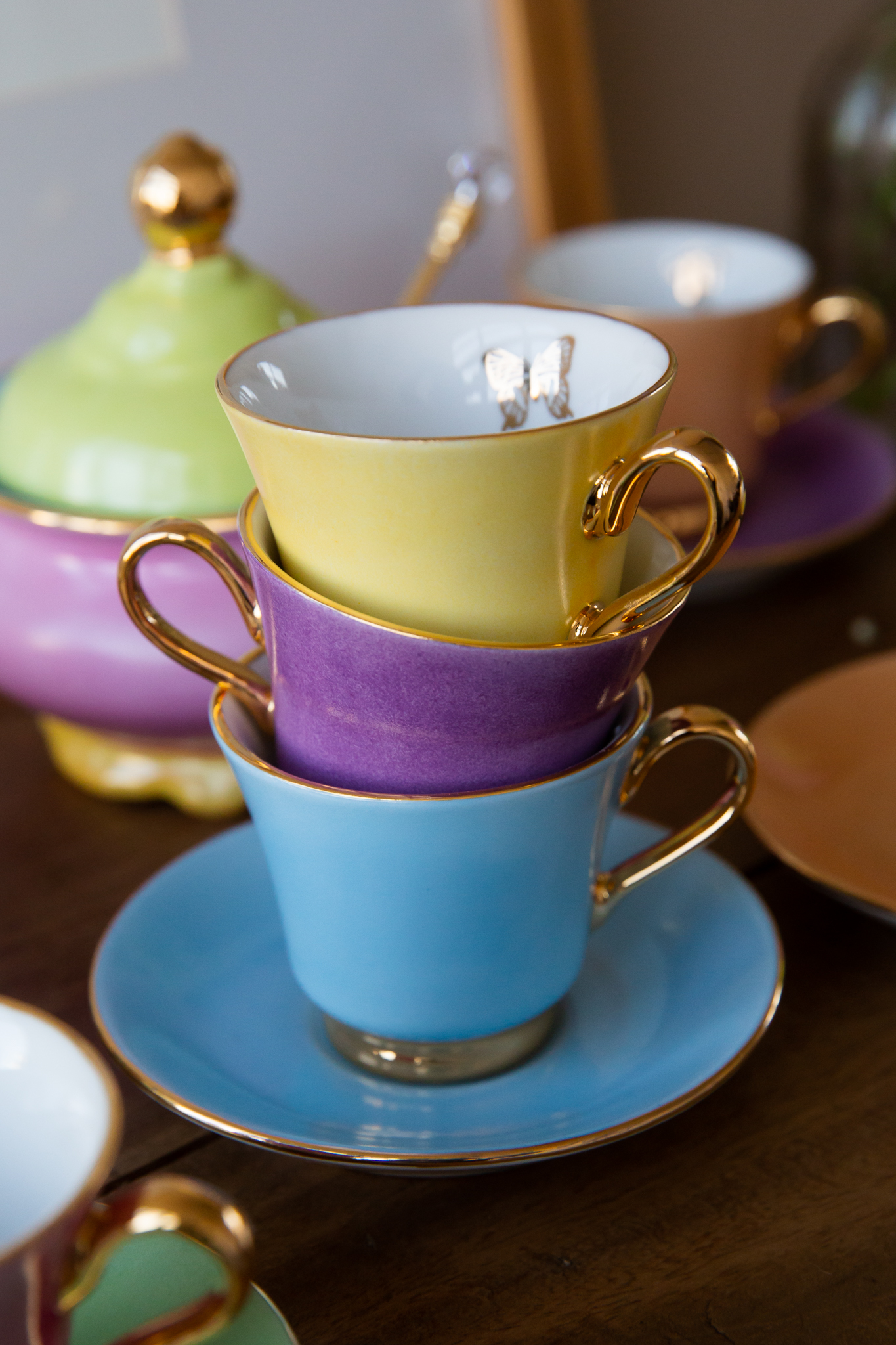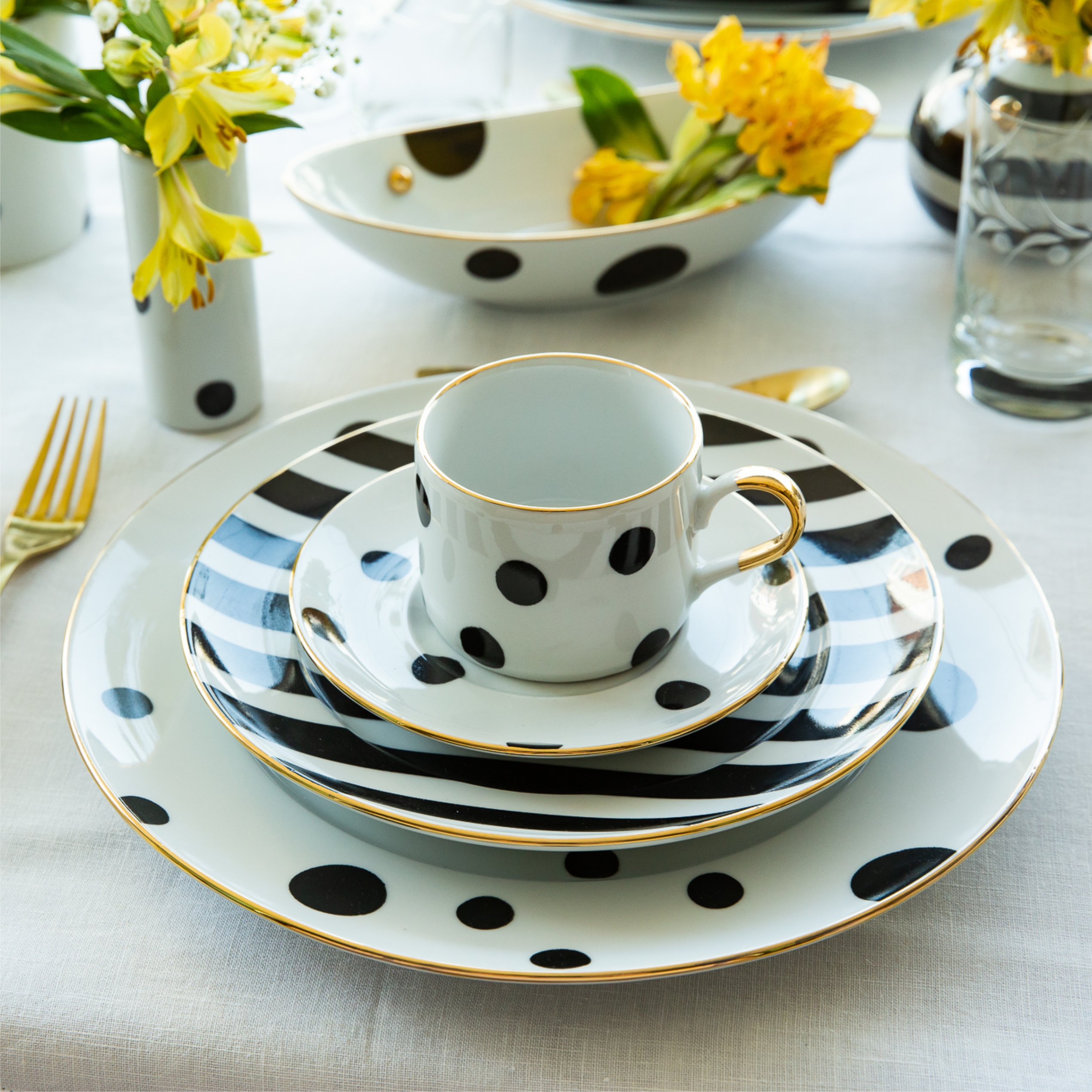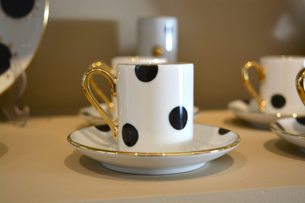 Xícara branca com estampa de bolas, e pires com bolas e detalhes em ouro 12%.