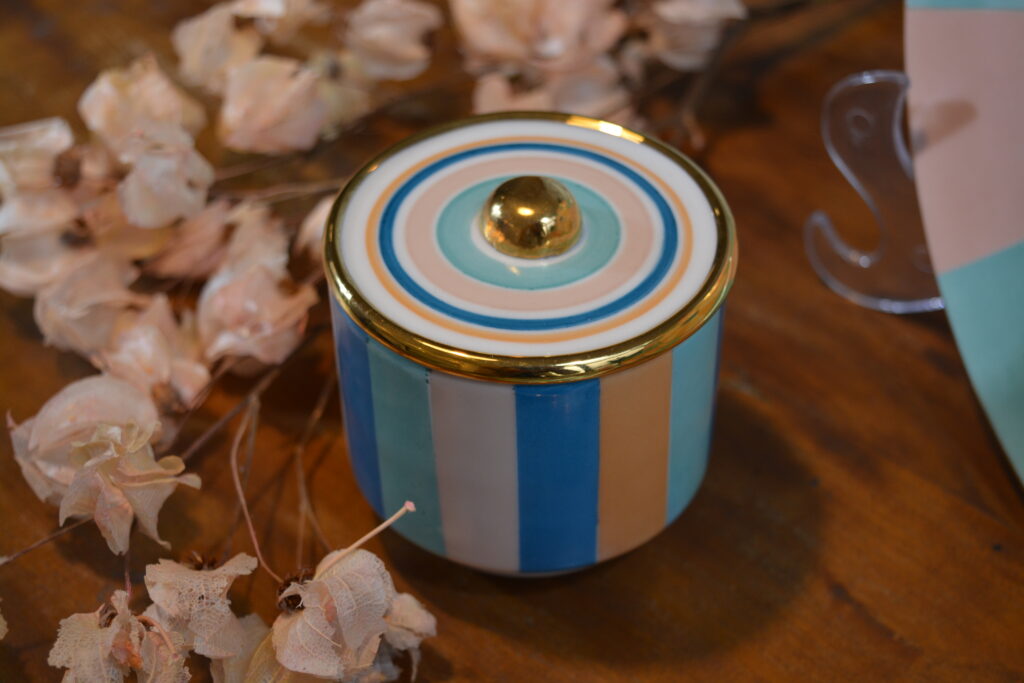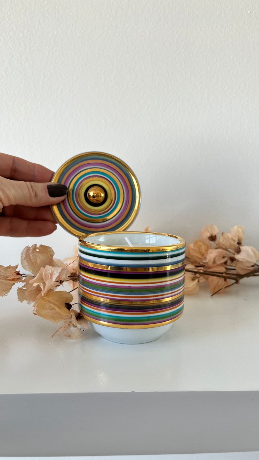 Vela aromática, com listras coloridas e tampa.
