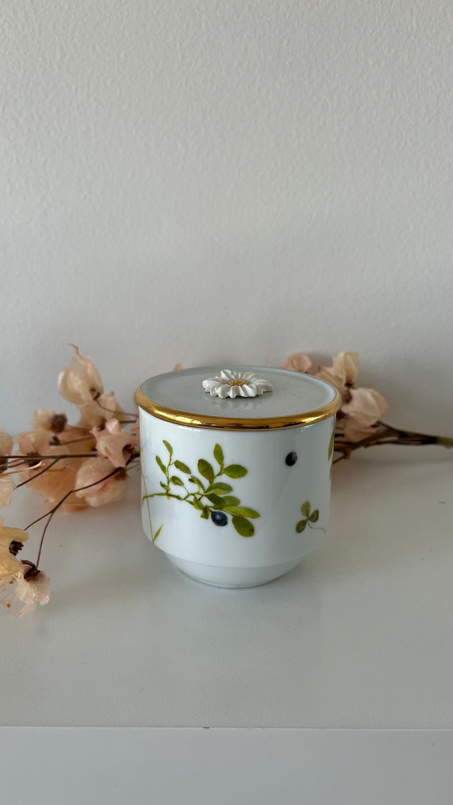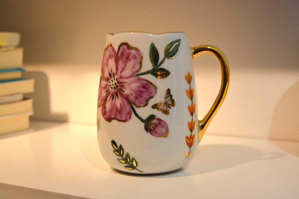 Caneca branca com estampa floral. alça dourada.