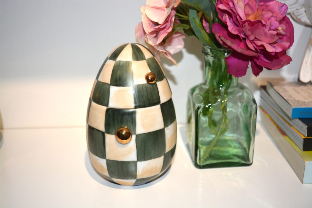 Ovo xadrez com pinceladas bege e aplique de bolas. Sugestão de uso: porta joias e mais…