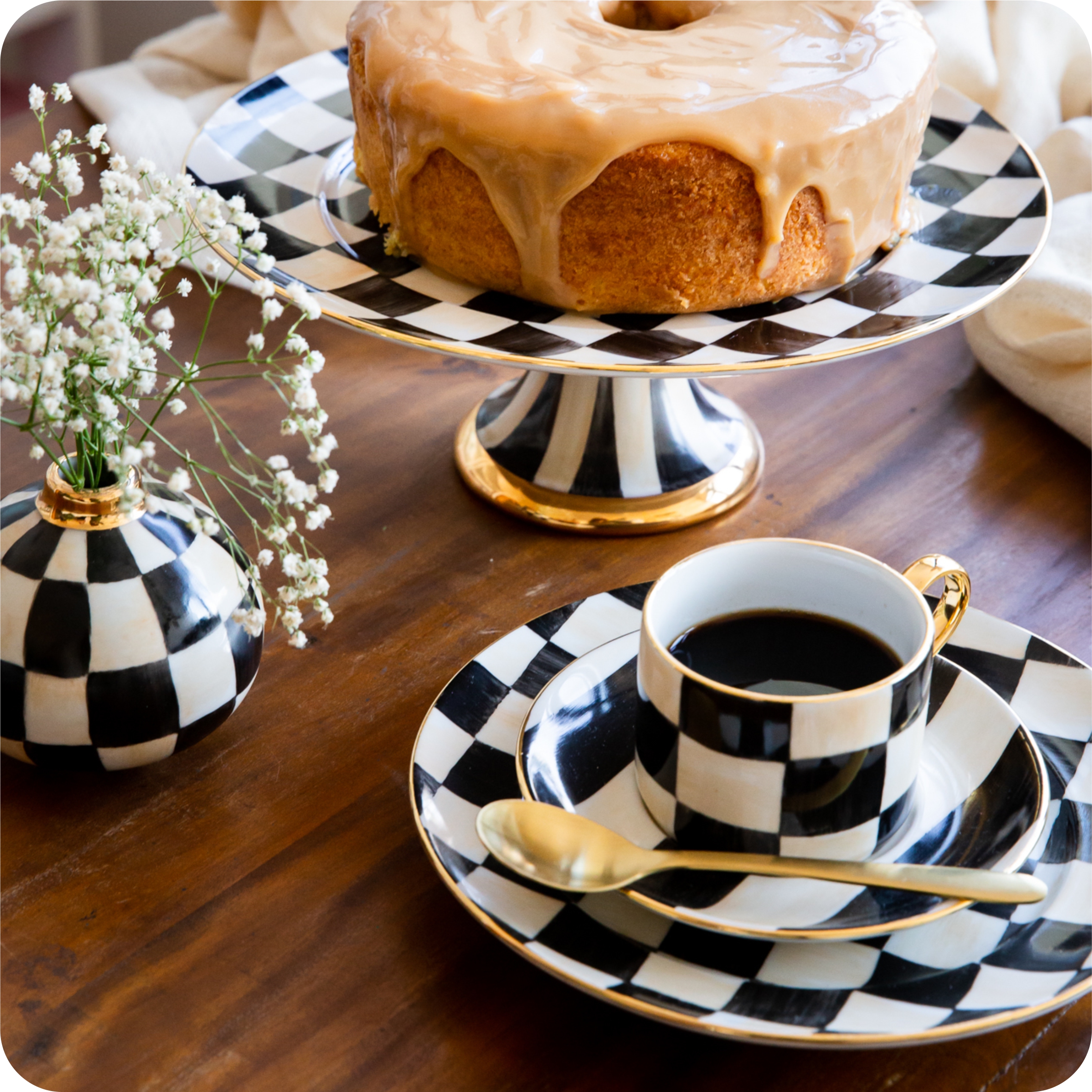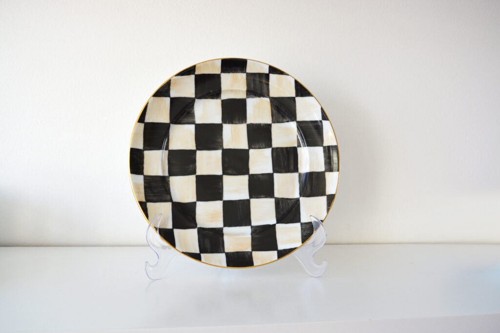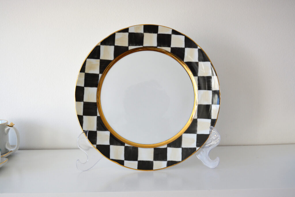 Prato xadrez preto com pinceladas bege na borda e acabamento em ouro 12%, medindo 26cm de diâmetro.