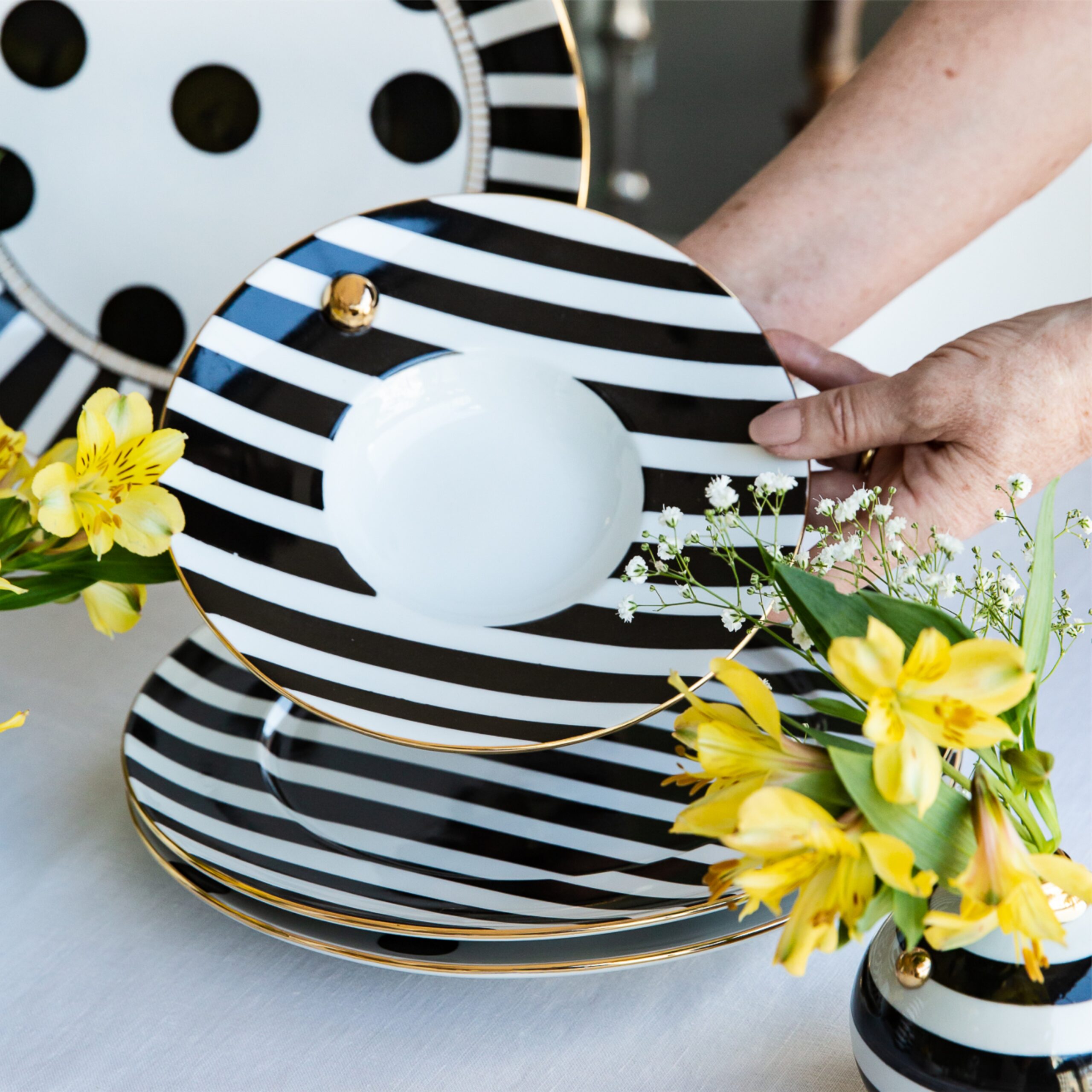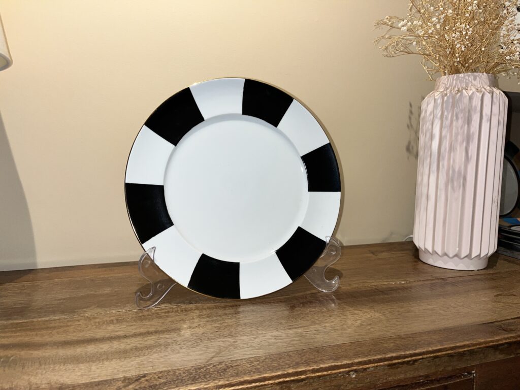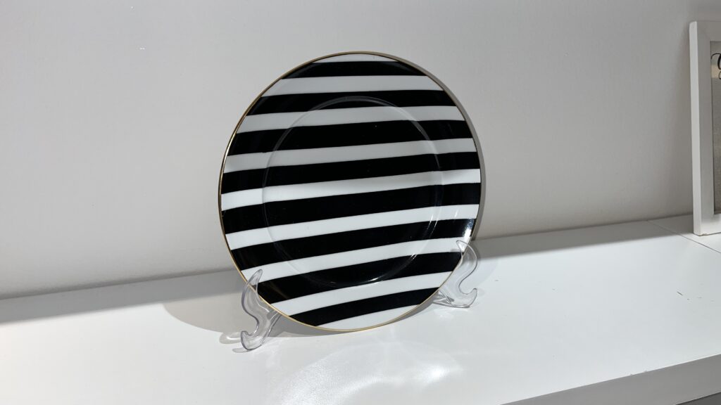 Prato raso em listra P&B acabamento em ouro 12% medindo 21cm de diâmetro