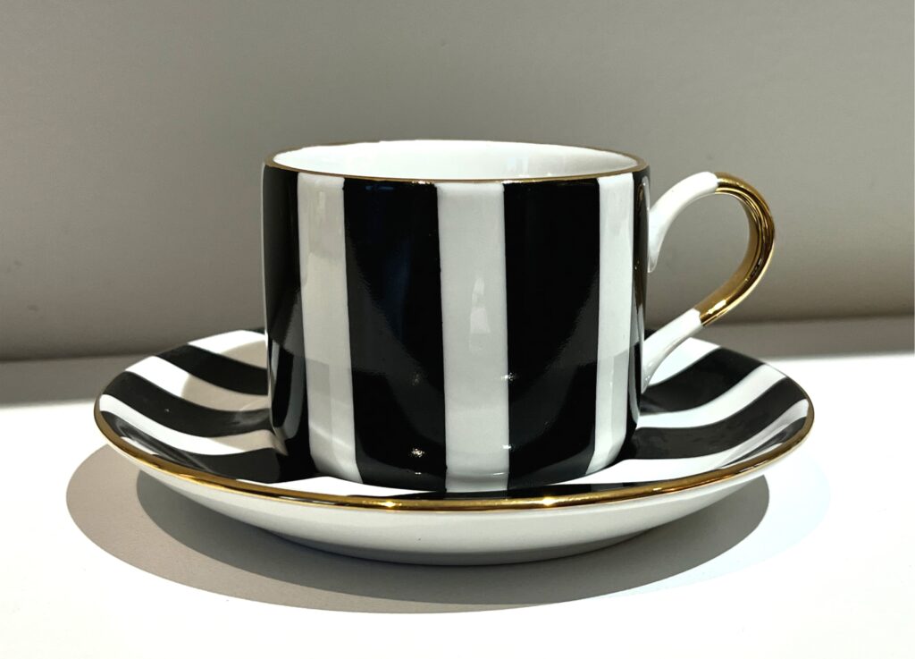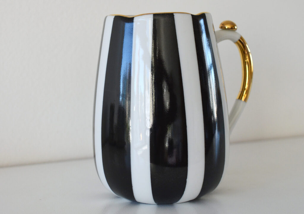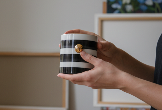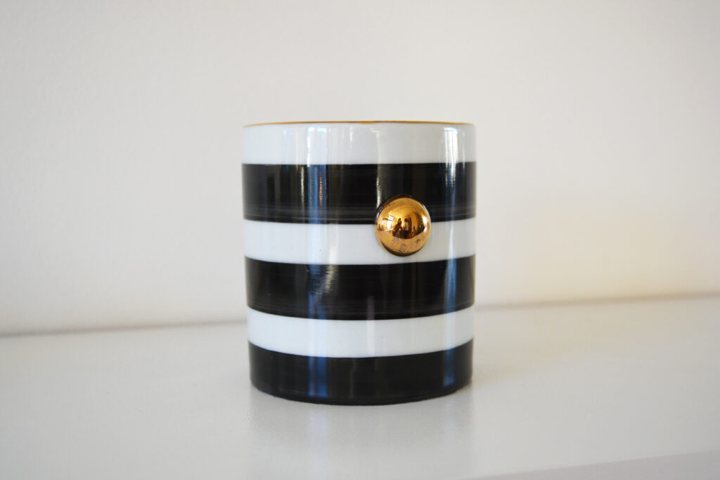 Caneca listrada P&B com aplique de bola e acabamento em ouro 12% – 328ml. Sugestão de uso: Bebidas, porta-lápis, porta-pincel, flor.