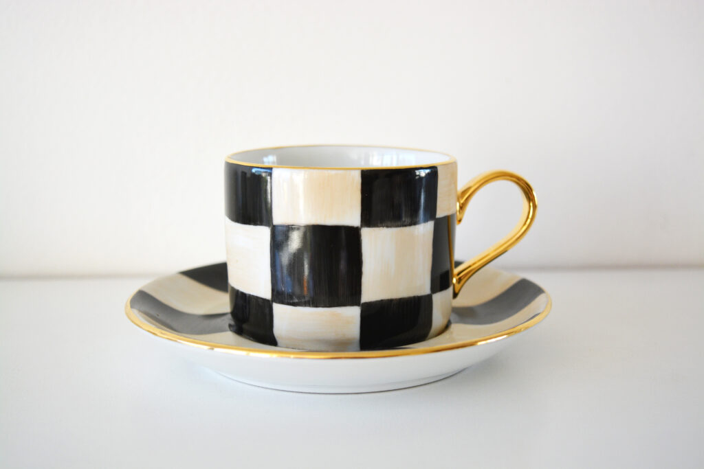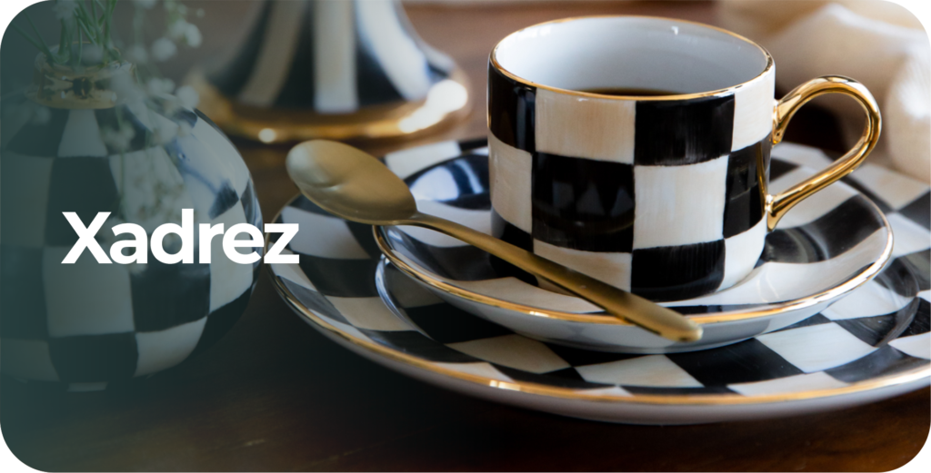 Caneca xadrez preta com pinceladas bege e acabamento em ouro 12%., medindo 10 de altura e 7,5 de diâmetro, com capacidade de 190 ml.