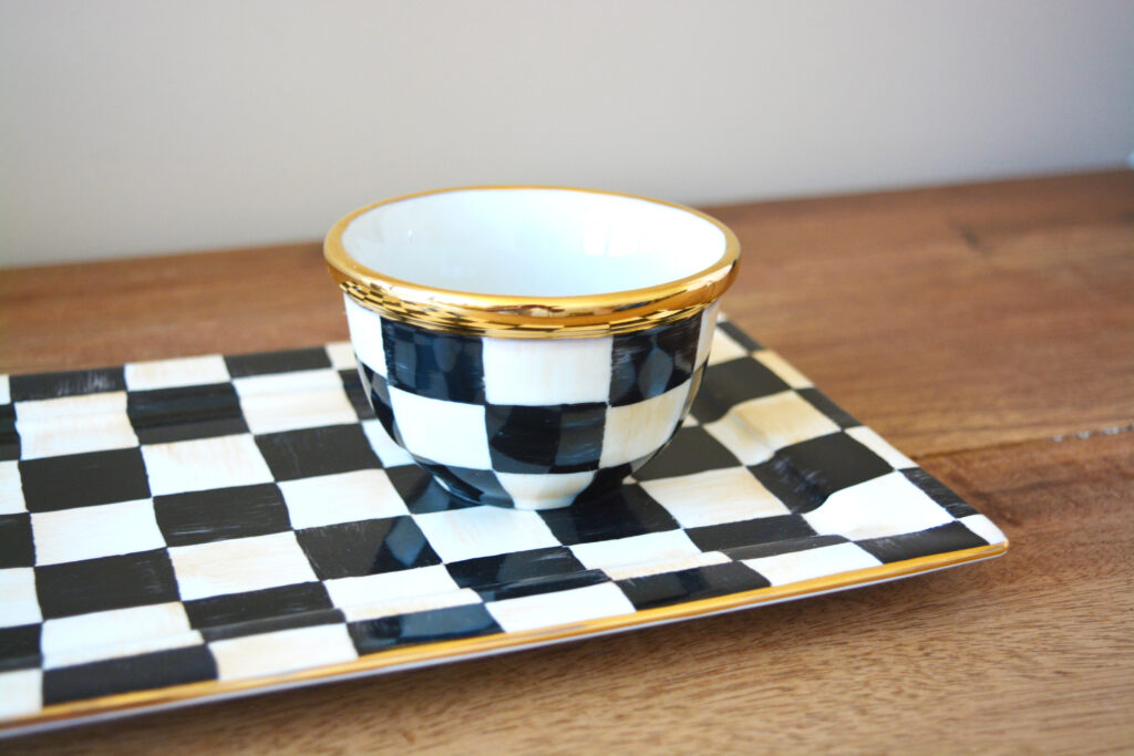 Bandeja xadrez preta com pinceladas bege e acabamento em ouro 12%, medindoi 25cm x 16cm. Sugestão de uso: Decor, petiscos, suporte para canecas e bowl