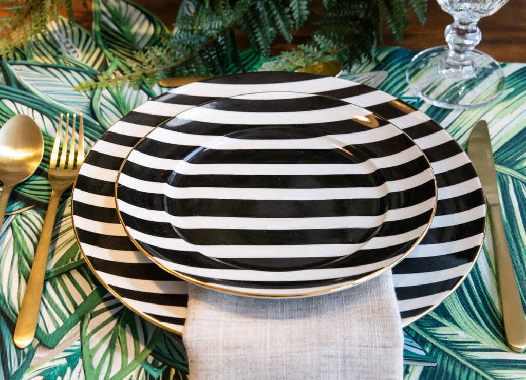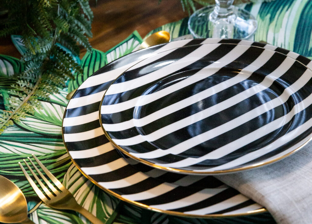 Prato raso em listra P&B acabamento em ouro 12% medindo 27,5 de diâmetro