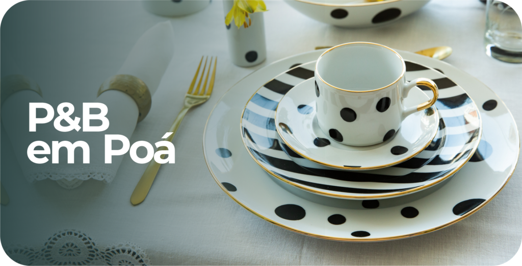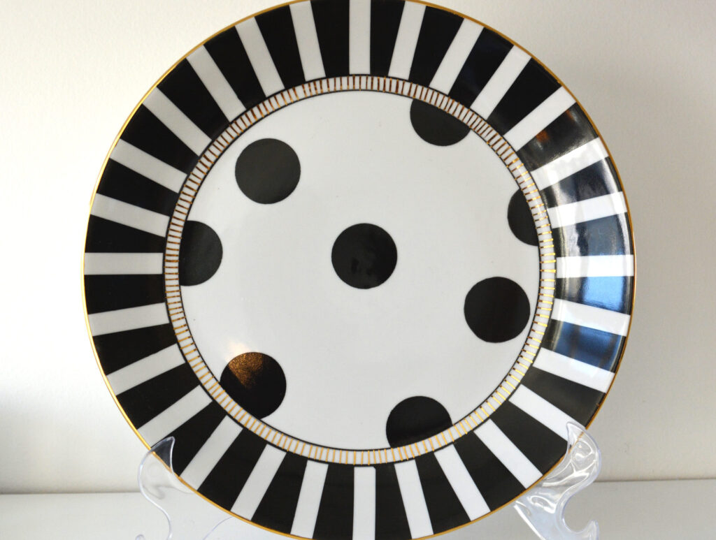 Prato em poá e listras P&B com acabamento em ouro 12%, medindo 4cm de altura x 30cm de diâmetro.