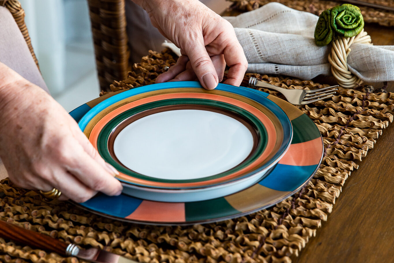 Prato branco com listras coloridas.