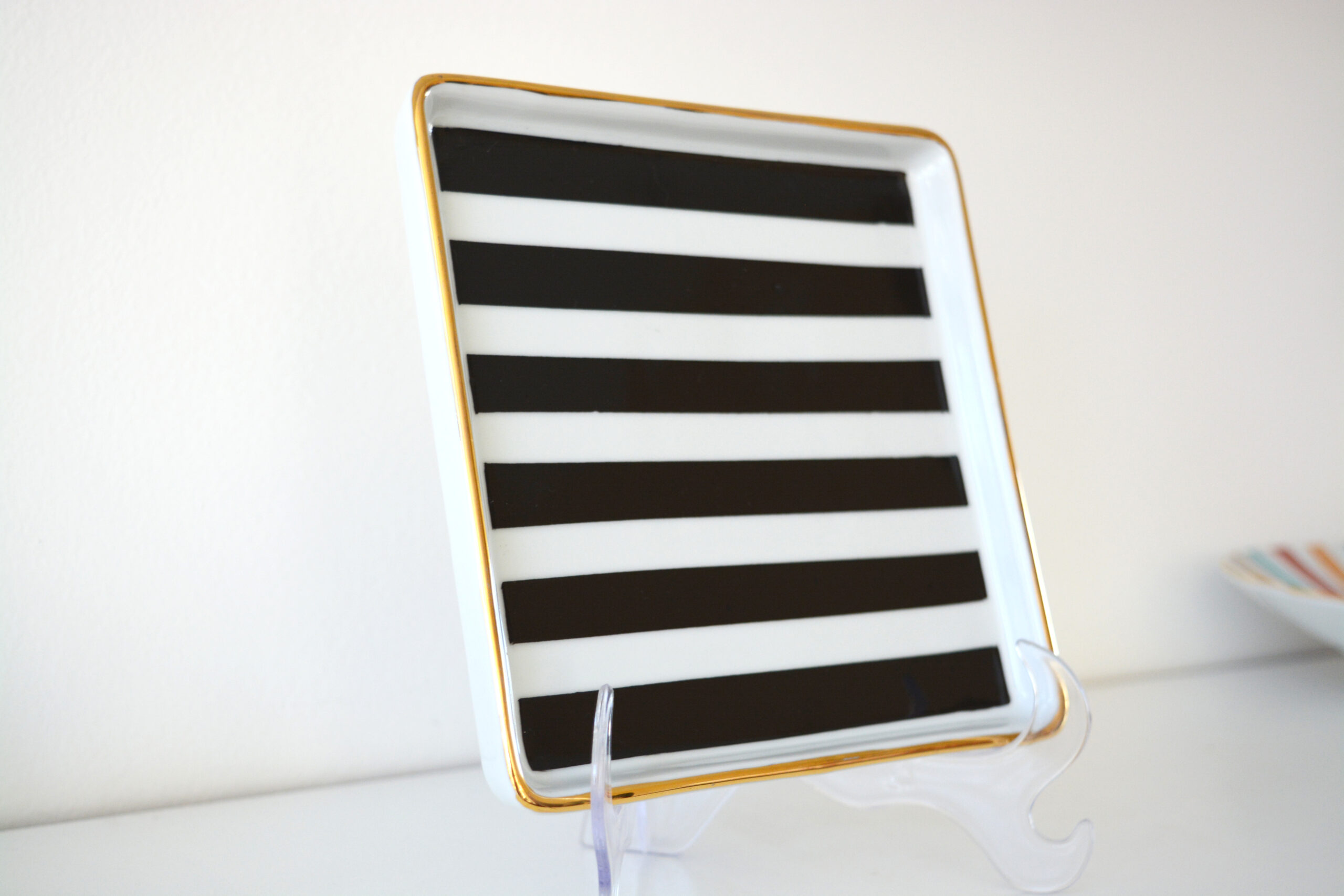 Peça com listra P&B, acabamento em ouro 12%, medindo 16cm x 16cm. Sugestão de uso: Decor, petiscos e como suporte para xícaras e canecas.