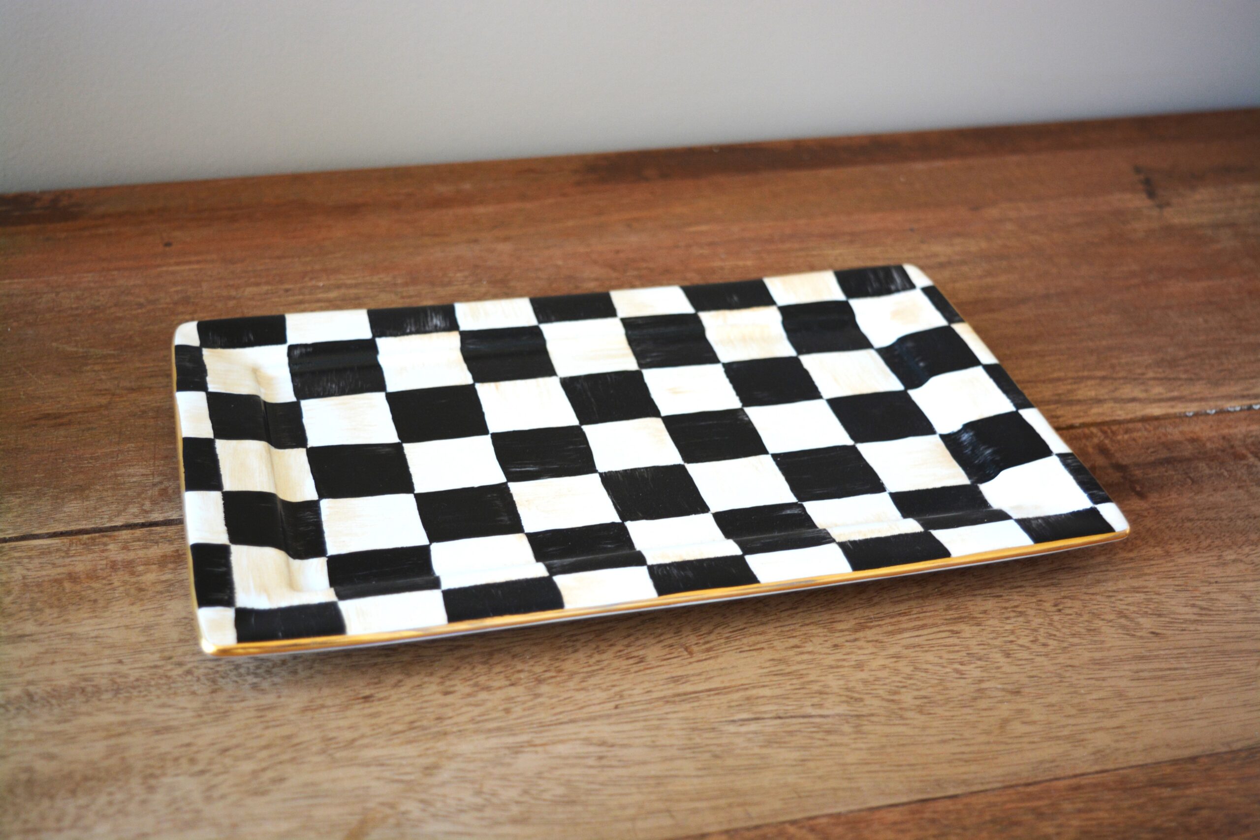 Bandeja xadrez preta com pinceladas bege e acabamento em ouro 12%, medindoi 25cm x 16cm. Sugestão de uso: Decor, petiscos, suporte para canecas e bowl