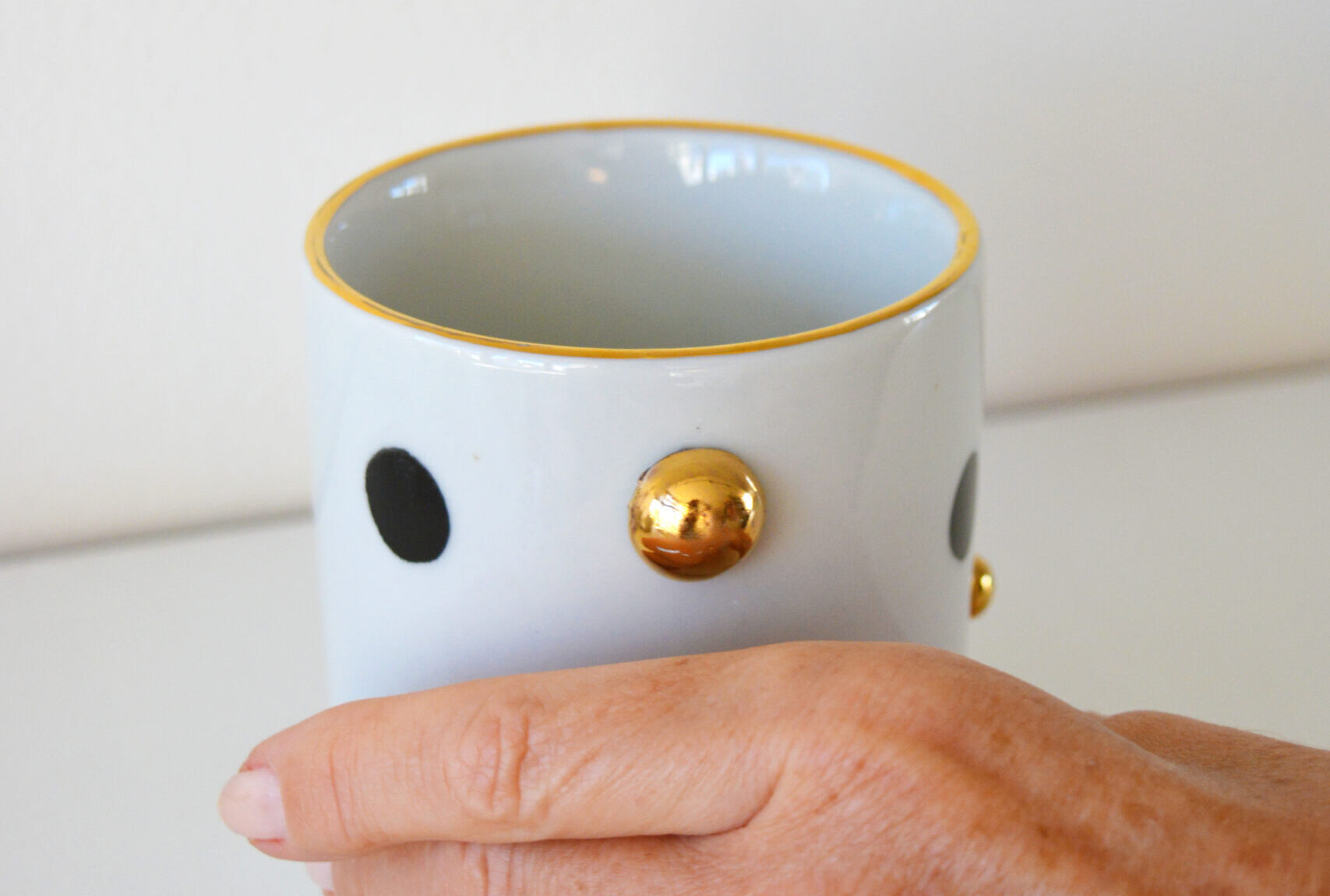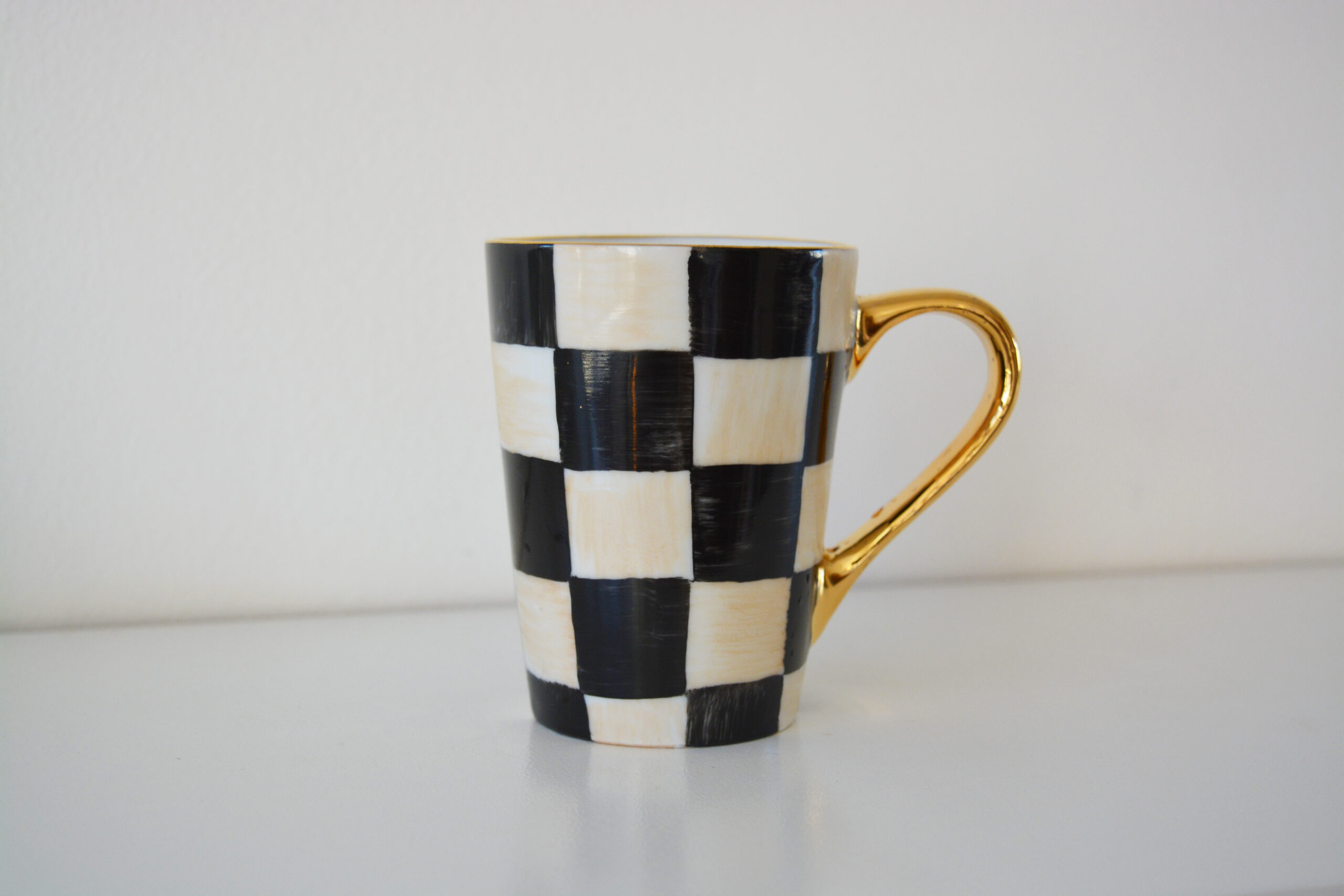 Caneca xadrez preta com pinceladas bege e acabamento em ouro 12%., medindo 10 de altura e 7,5 de diâmetro, com capacidade de 190 ml.