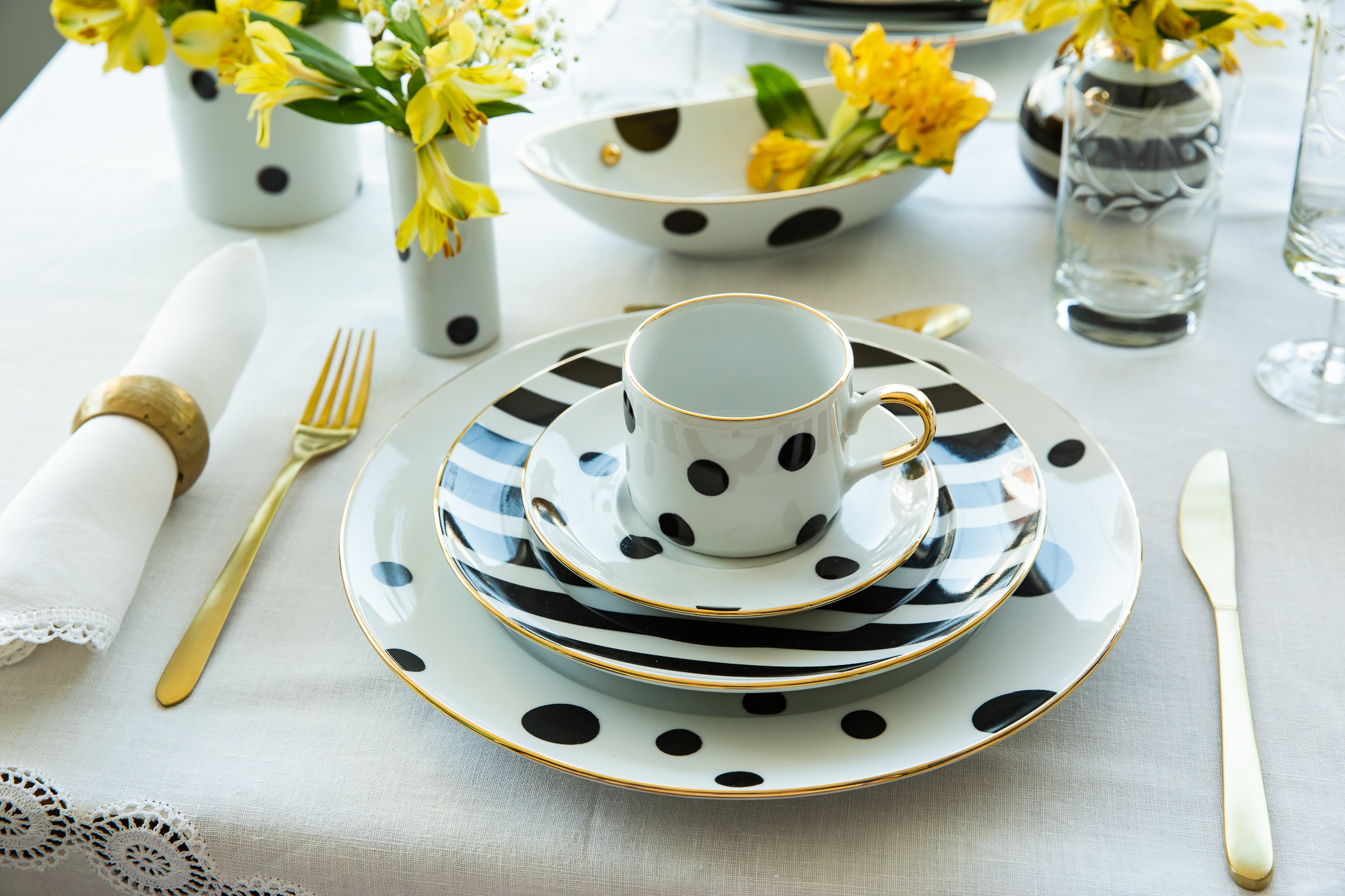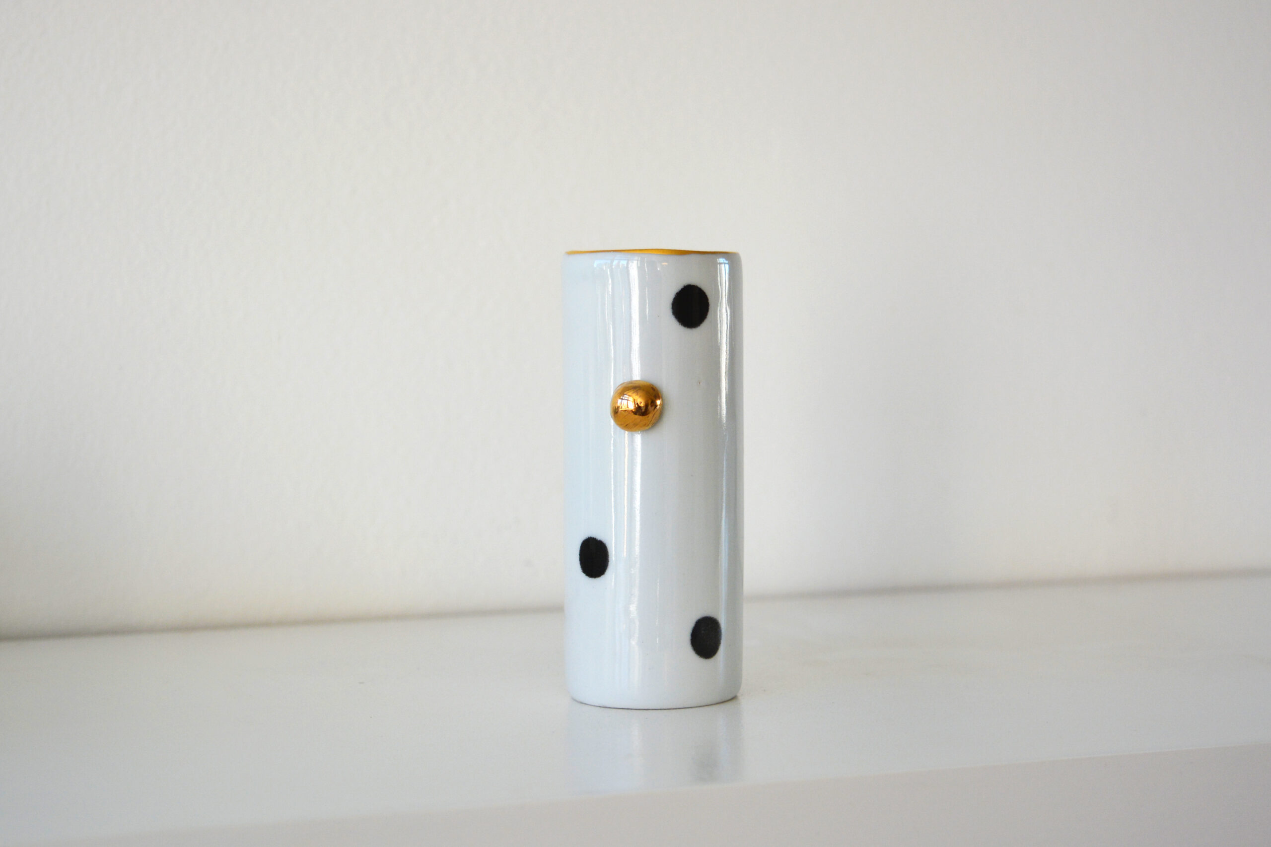 Caneca listrada P&B com aplique de bola e acabamento em ouro 12% – 328ml. Sugestão de uso: Bebidas, porta-lápis, porta-pincel, flor.
