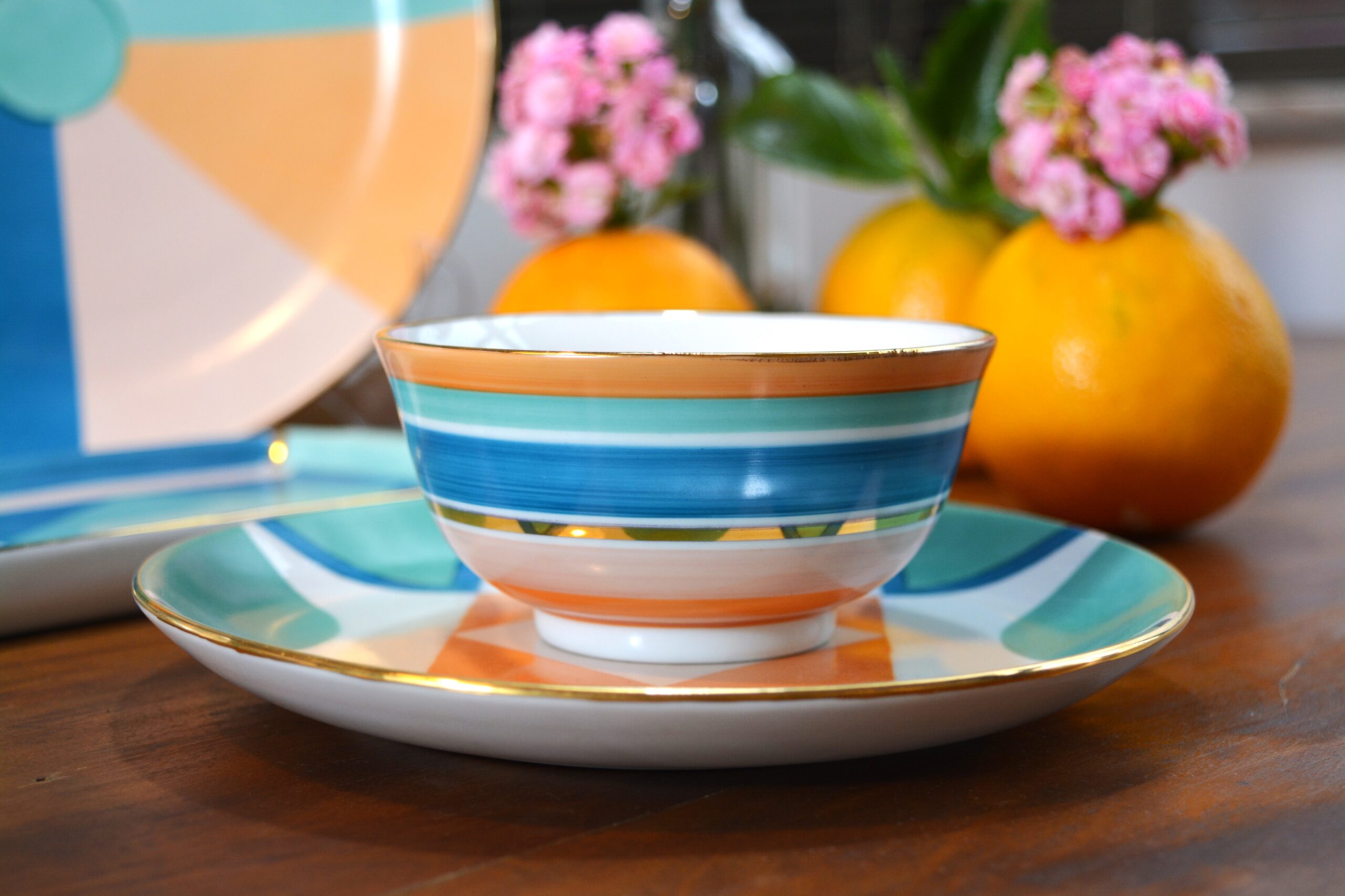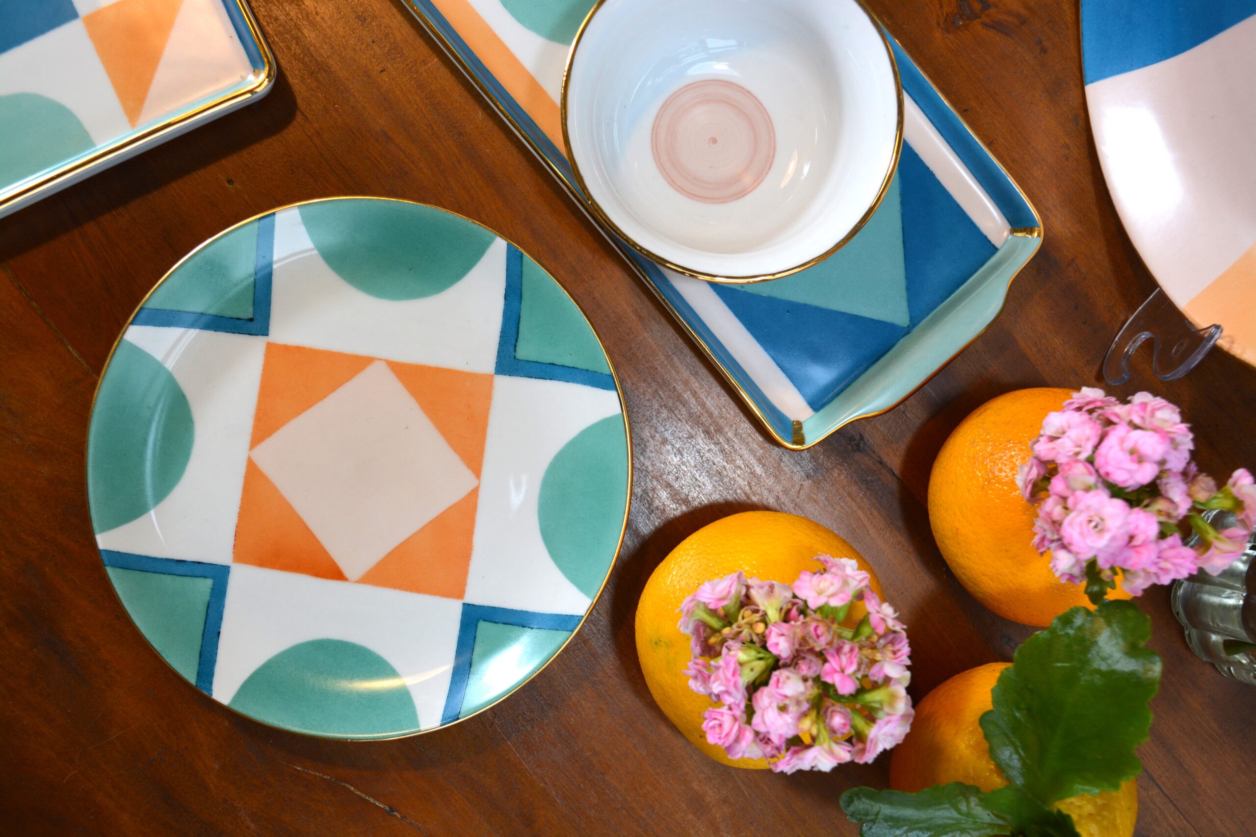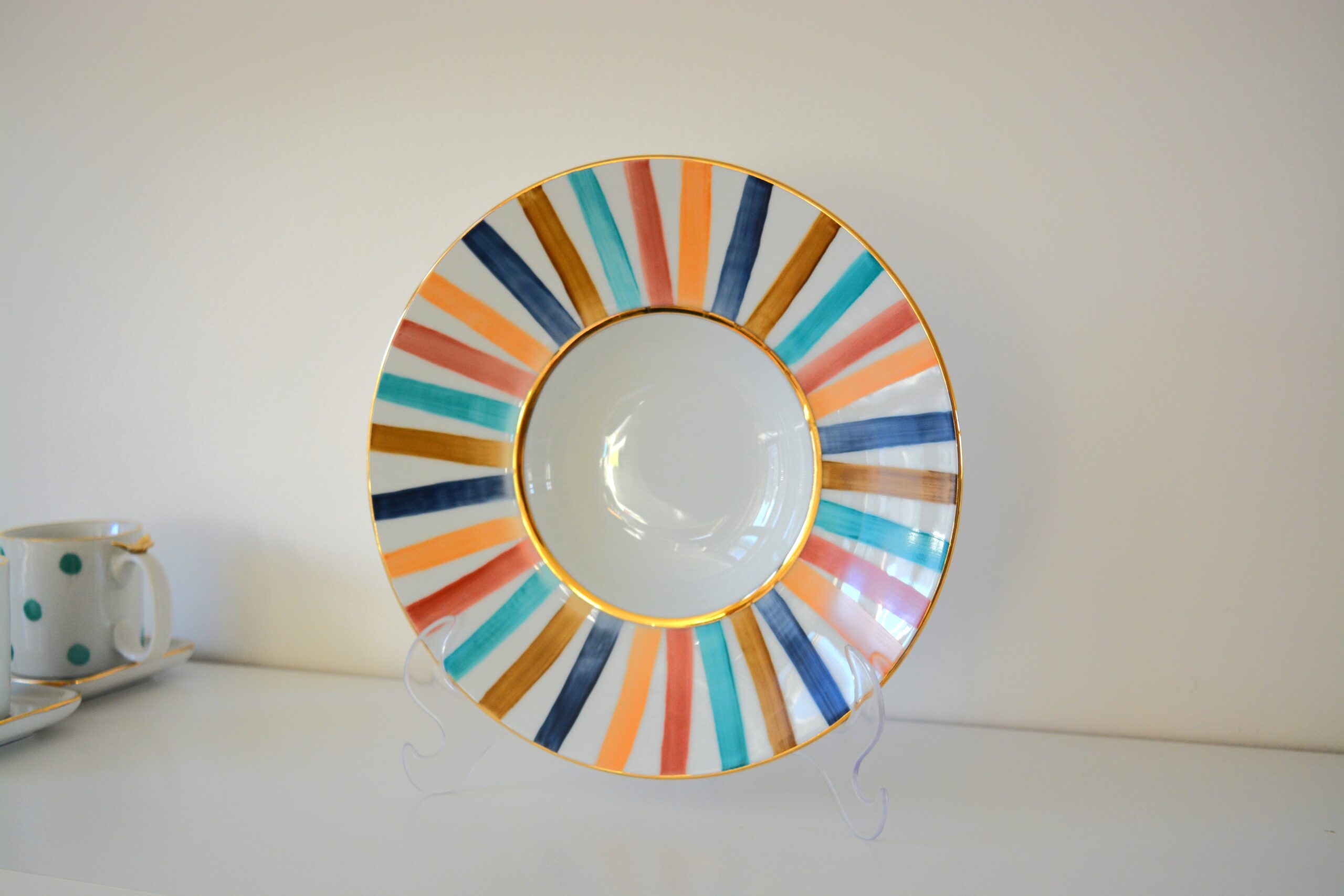 Prato de burrata, com listras coloridas e detalhes em ouro 12%.