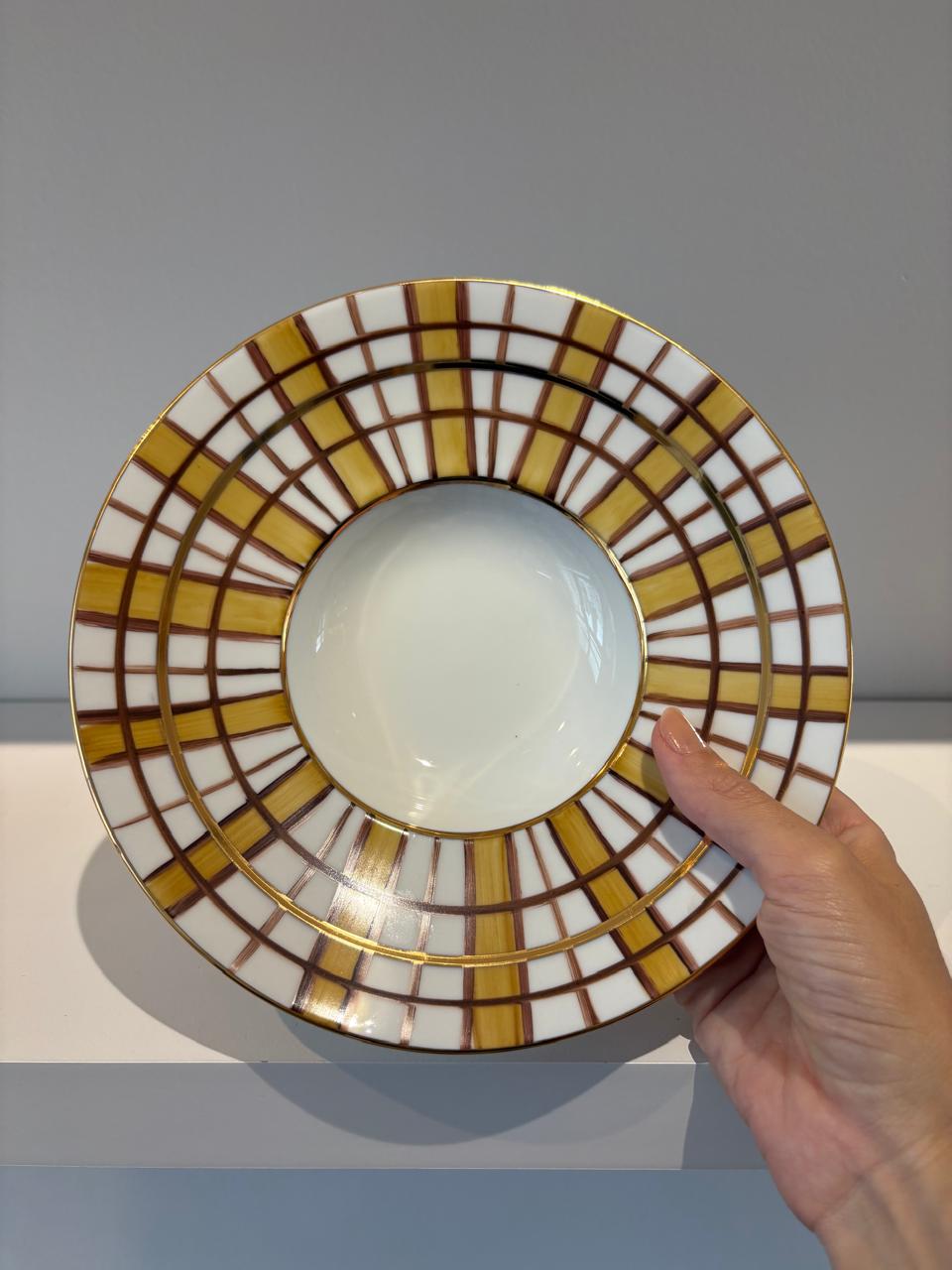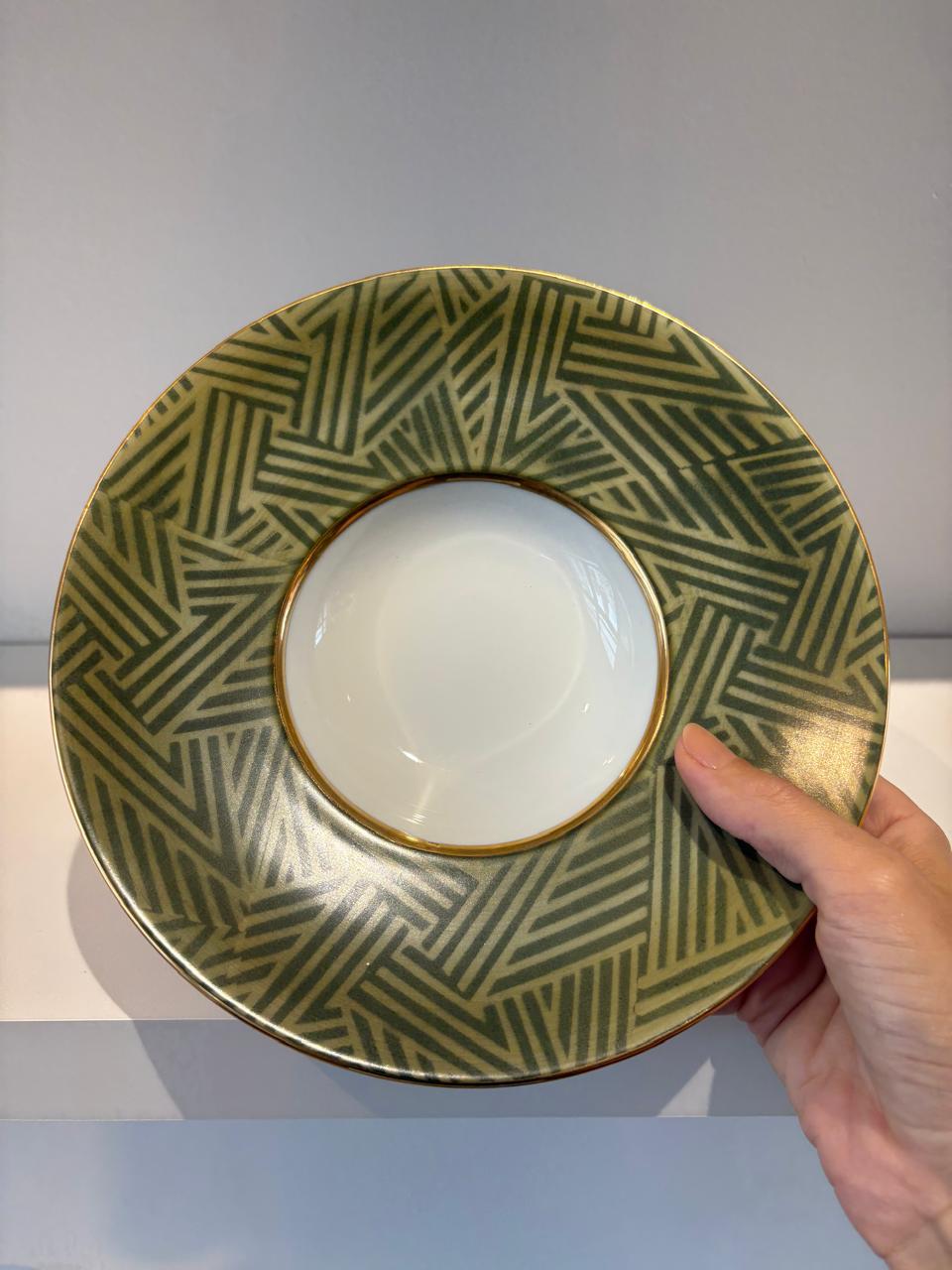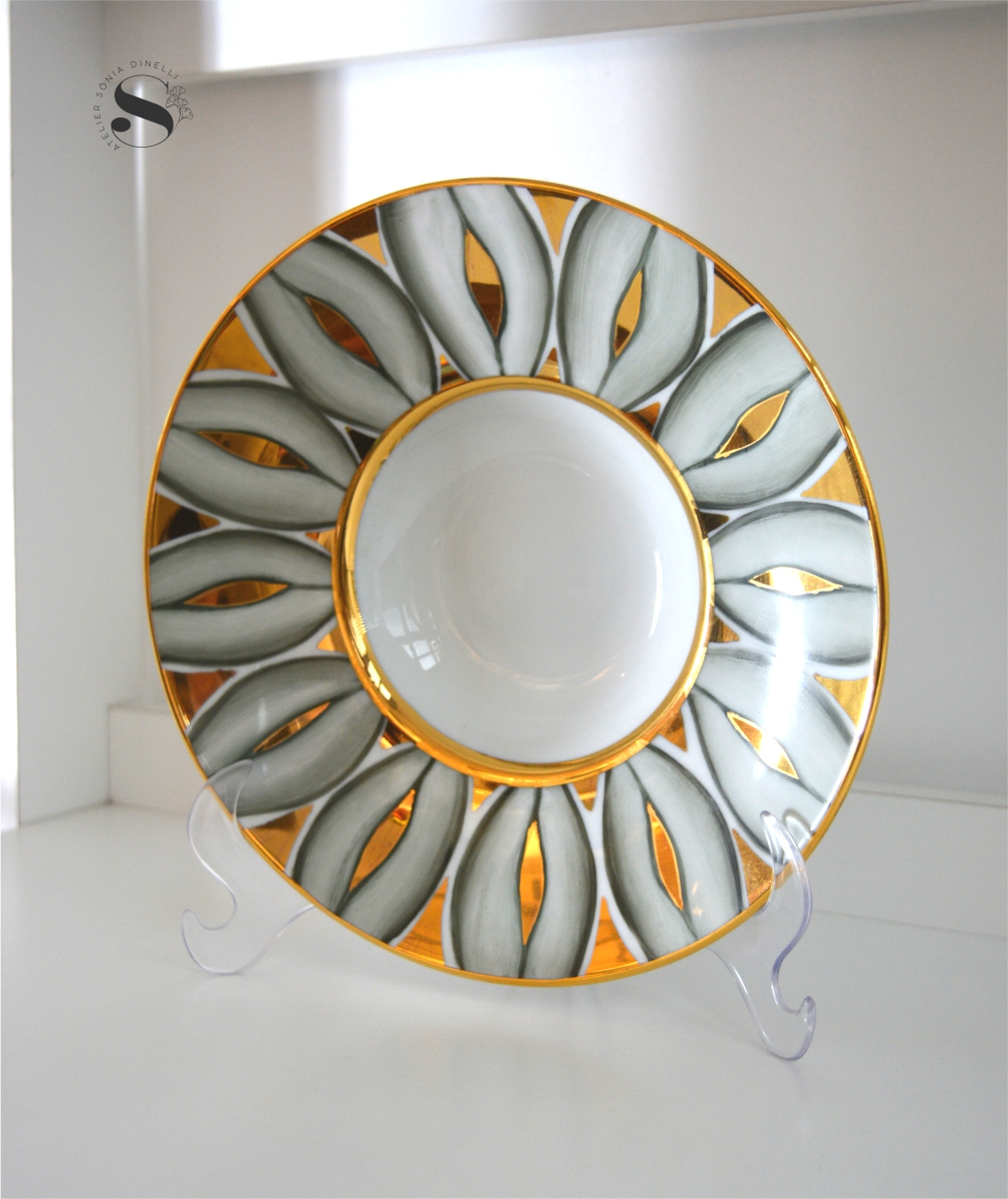 Prato de Burrata branco com estampa geométrica e detalhes em ouro 12%.