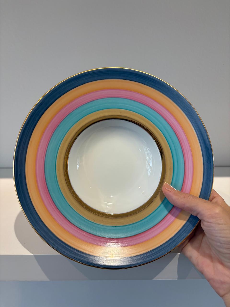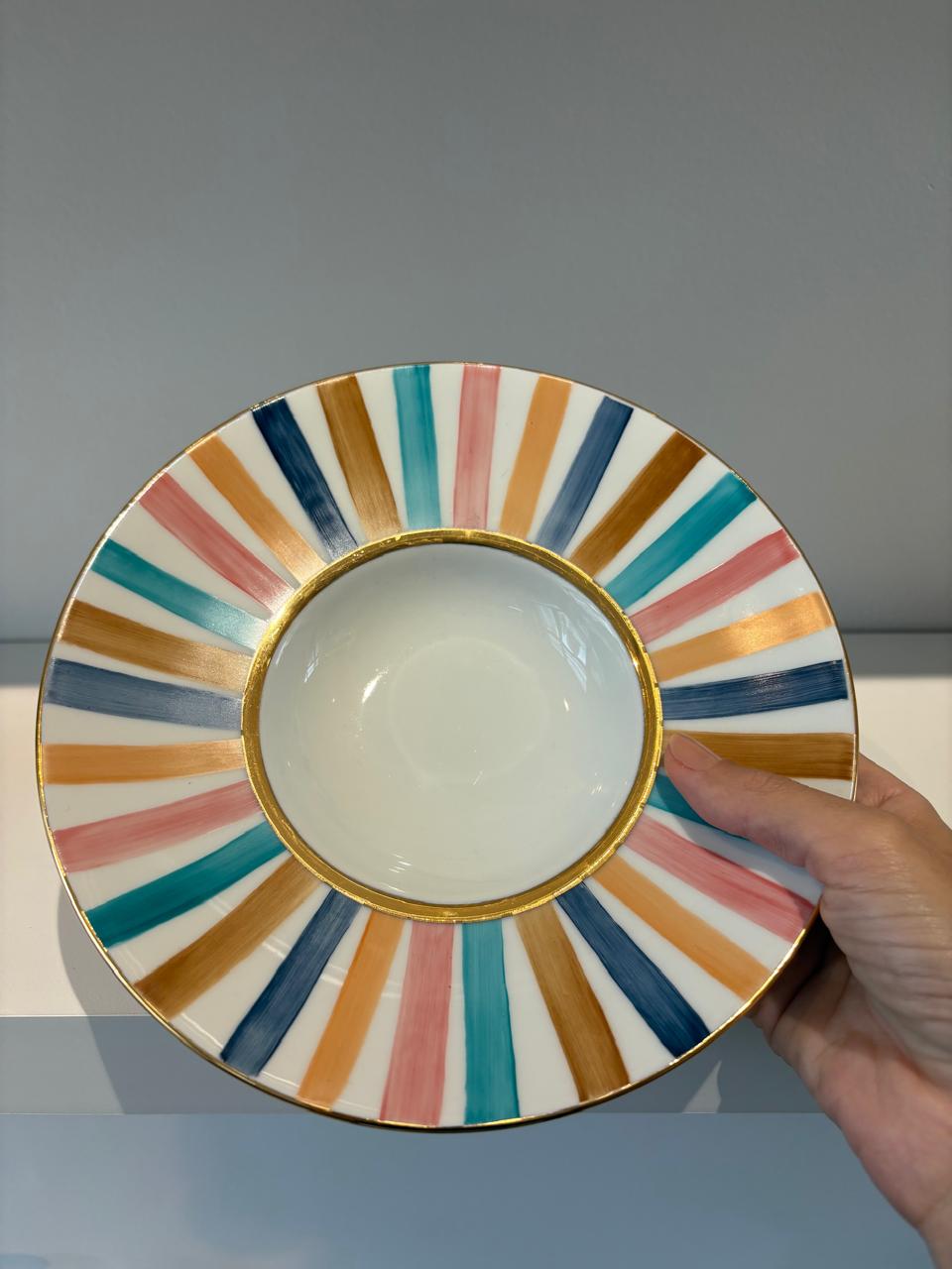 Prato de Burrata branco com borda em listras coloridas e detalhes em ouro 12%
