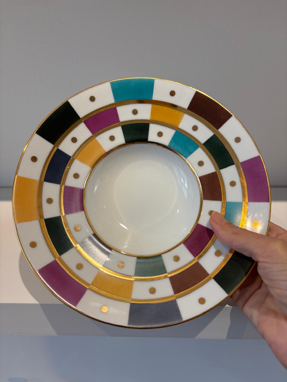 Prato de Burrata branco com borda em listras coloridas e detalhes em ouro 12%.