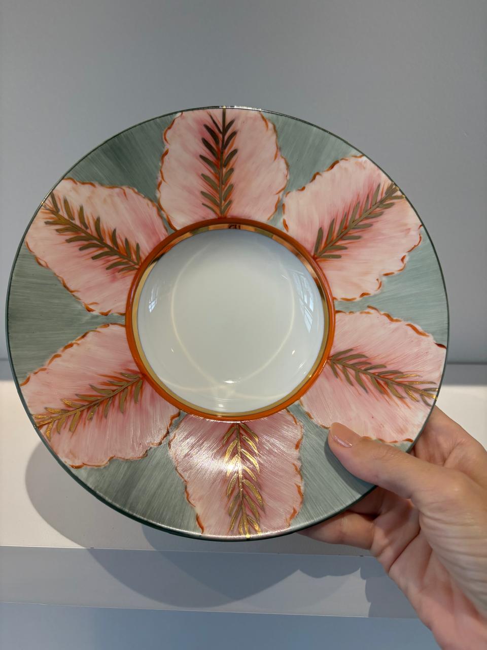 Prato de Burrata branco com estampa floral e detalhes em ouro 12%.
